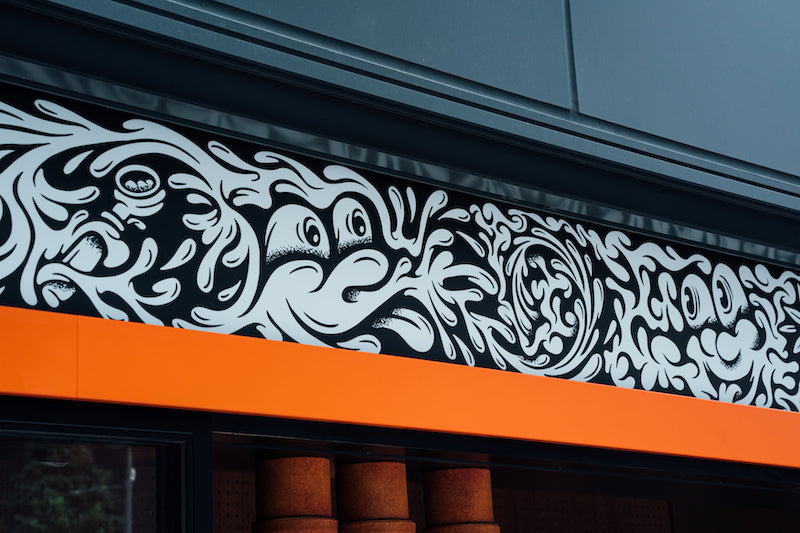 その店内正面やオーニングに施されたデザインは、シドニー在住の日本人アーティスト、Kentaro Yoshida氏によるものです。この印象的なアート「In Awe of Coffee」は、コーヒーの成長から収穫、加工、焙煎、抽出に至るまでの主要なステージを描いています。