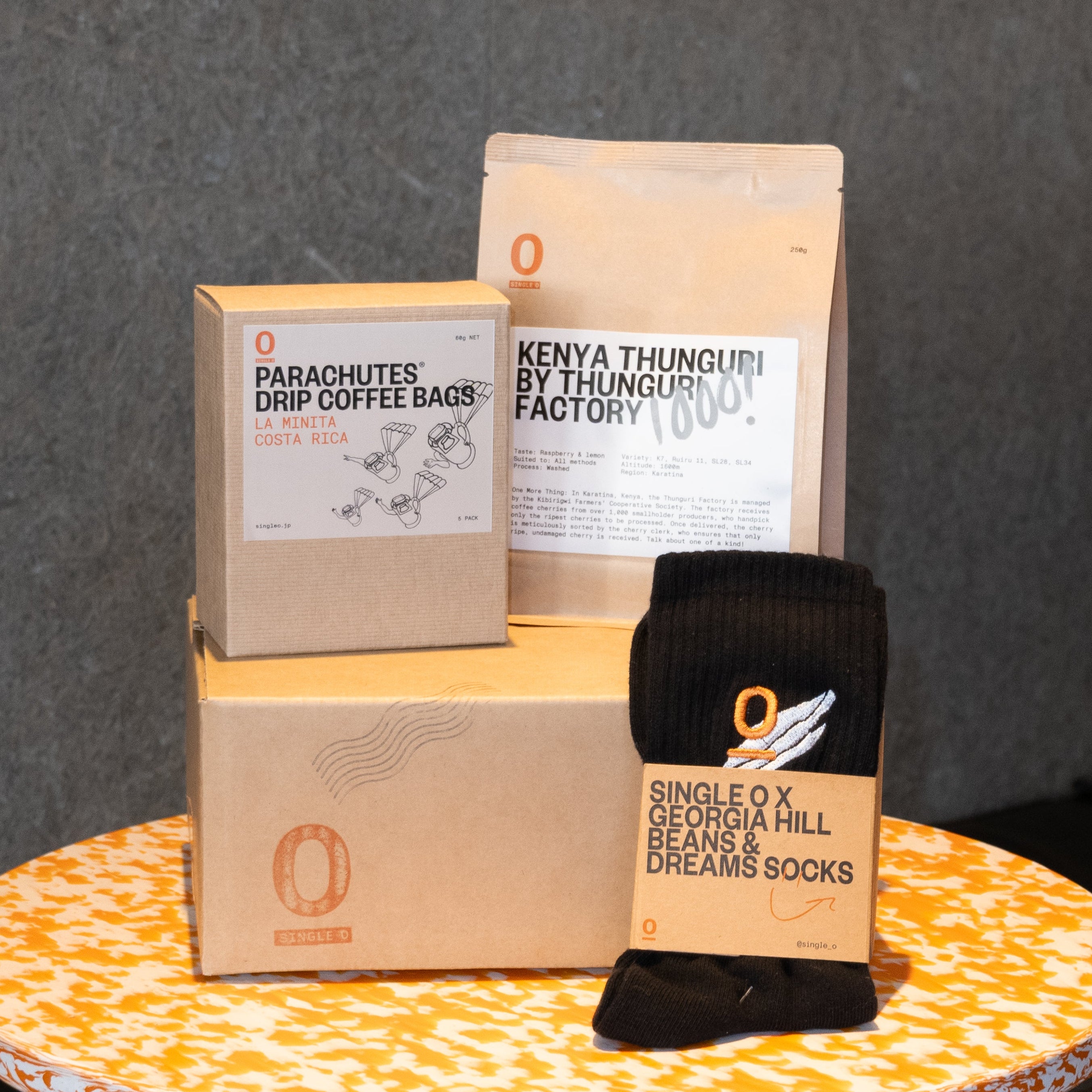 Single O のモットー「BEANS&DREAMS」から生まれたデザインの靴下が登場。こちらの靴下は、アートバッグプロジェクトの3番目の作品として知られるジョージアヒルの特別なデザインが施されています。ワンポイントのオレンジがお洒落。