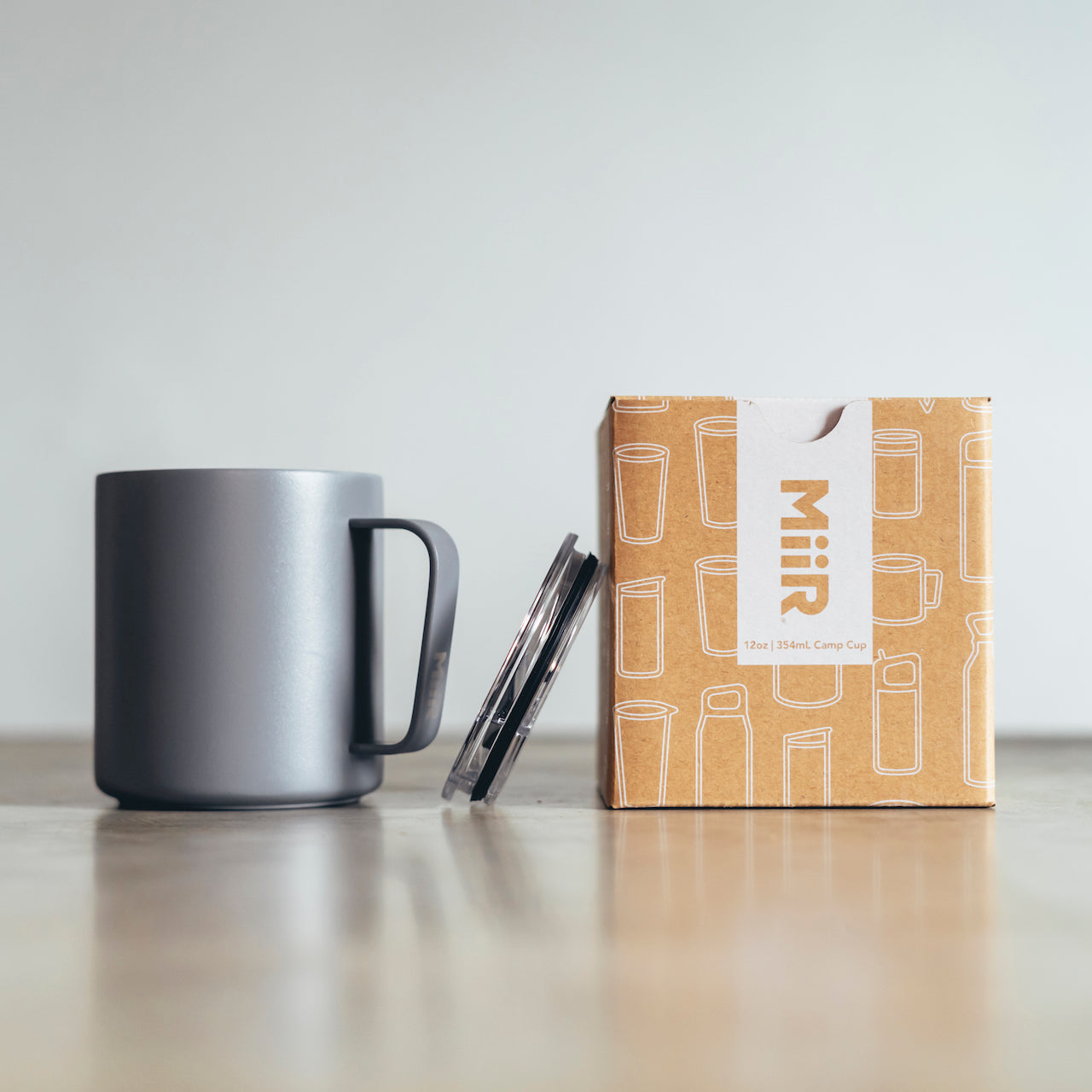 「Beans & Dreams」デザインのMiir Camp Cup。保温・保冷構造のカップは寒い日でも、温かいコーヒーを長く楽しんでいただけます。